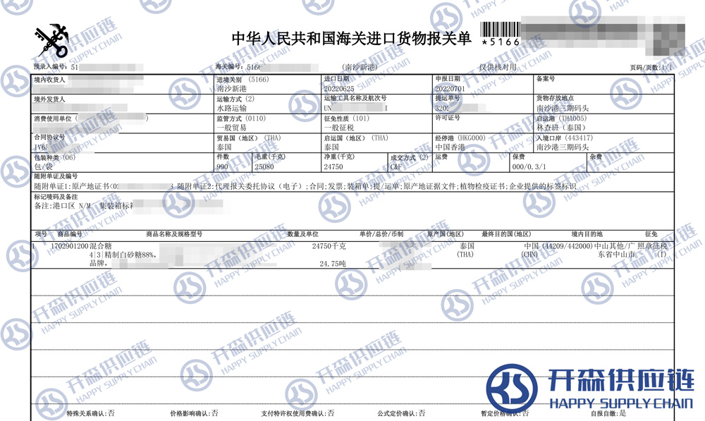 【本文結語】 上述就是廣州南沙港泰國混合糖進口報關代理服務【經典案例】的全部內容,希望能對您有所幫助,如有廣州進口清關上任何疑問及問題可隨時在線聯系我們或撥打 18002611553,開森供應鏈擁有豐富的廣州進口清關操作經驗及案例,10余年進口經驗為您所用,各類進口疑難都能為您一一解答及協助快速處理解決!